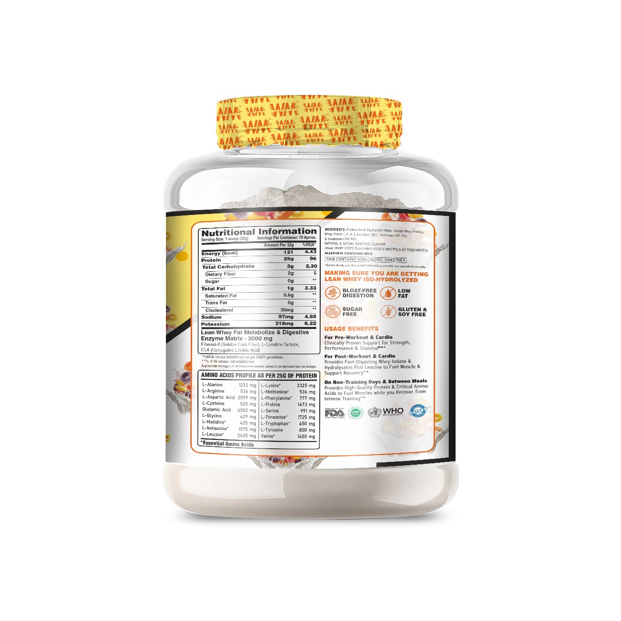 - Digestive Enzyme Matrix: Includes a blend of digestive enzymes such as Fiit-ns® (Soluble Corn Fiber), L-Carnitine Tartrate, and CLA (Conjugated Linoleic Acid) for optimal digestion and nutrient absorption.